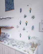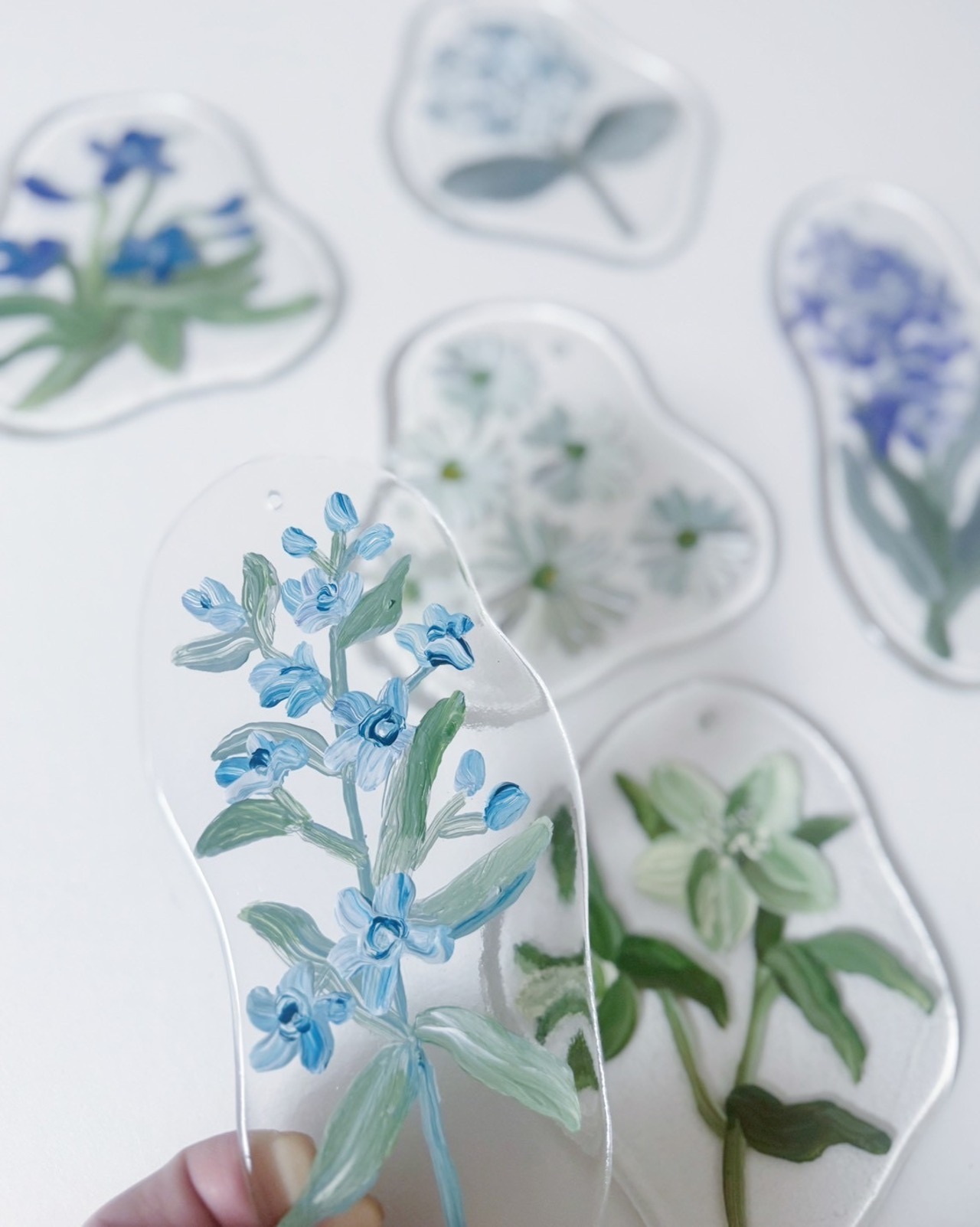 沖さんがキルンワークで制作した、オリジナルのガラスプレートに、大槻さんが植物絵を描いてくださっています。